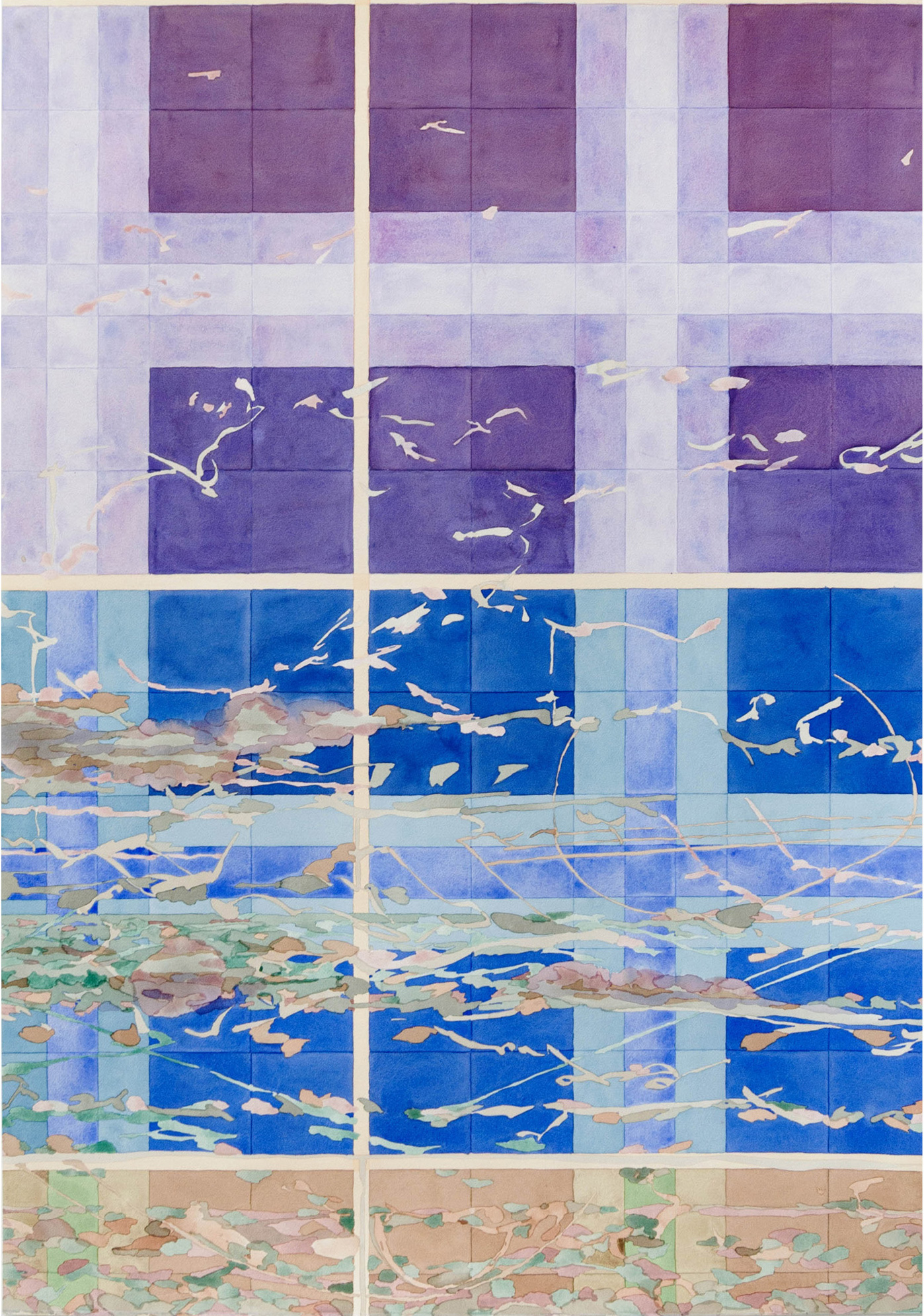 Lina Maria Sommer zeigt in ihrer Ausstellung «Summen» eine Serie grossformatiger Aquarelle, komponiert aus fliessenden Gesten, eingebettet in geometrische Raster. Aus Ihrer tiefgreifenden Auseinandersetzung mit dem Material und einer präzisen Arbeitsweise entstehen räumlich und landschaftlich anmutende Motive, deren Farbigkeit in den Lichtverhältnissen der Jahreszeiten nuanciert. Monate werden zu Bildern, Bilder zu diagrammatischen Aufzeichnungen von Zeit.